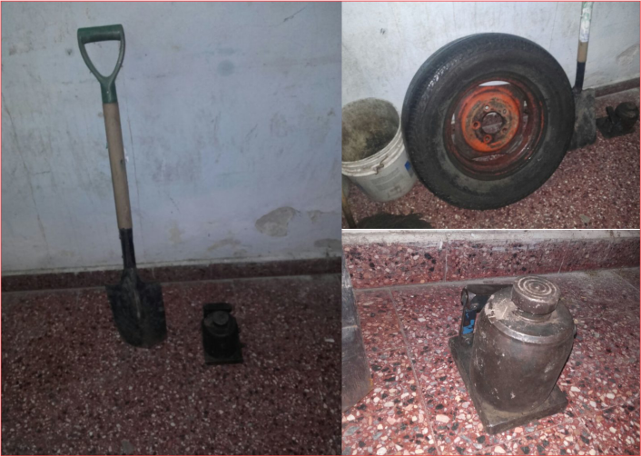 Realizada la requisa en el lugar se procedió al secuestro preventivo de una pala de punta, un gato hidráulico y un neumático.