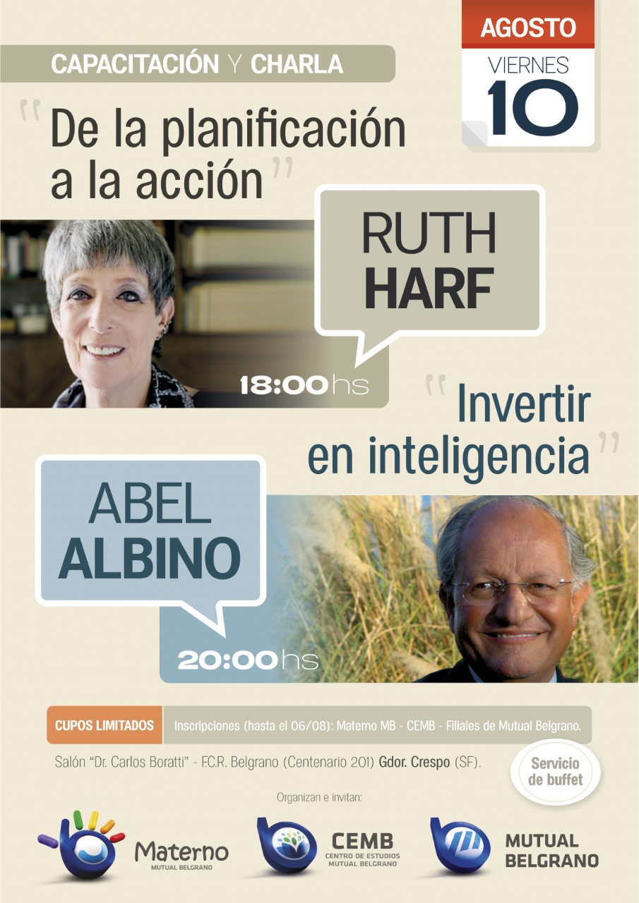 Desde Mutual Belgrano, con la participación de Materno Mutual Belgrano y Centro de Estudios Mutual Belgrano, se invita a participar de la Charla y Capacitación que estarán brindando el próximo viernes de 10 de agosto los prestigiosos disertantes Ruth Harf y Abel Albino en el Salón Dr. Carlos Boratti del Club Belgrano.