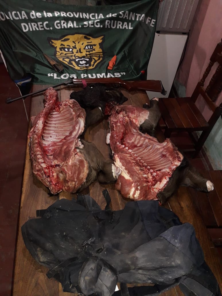 Cabe recordar que la policía había divisado la circulación de una motocicleta con dos ocupantes, a simple vista transportaba  uno de ellos el arma de fuego. Al momento de identificarlos emprendieron huida dirigiéndose por la banquina, dejando la moto abandonada y arrojando una mochila con las medias res de un ternero.
