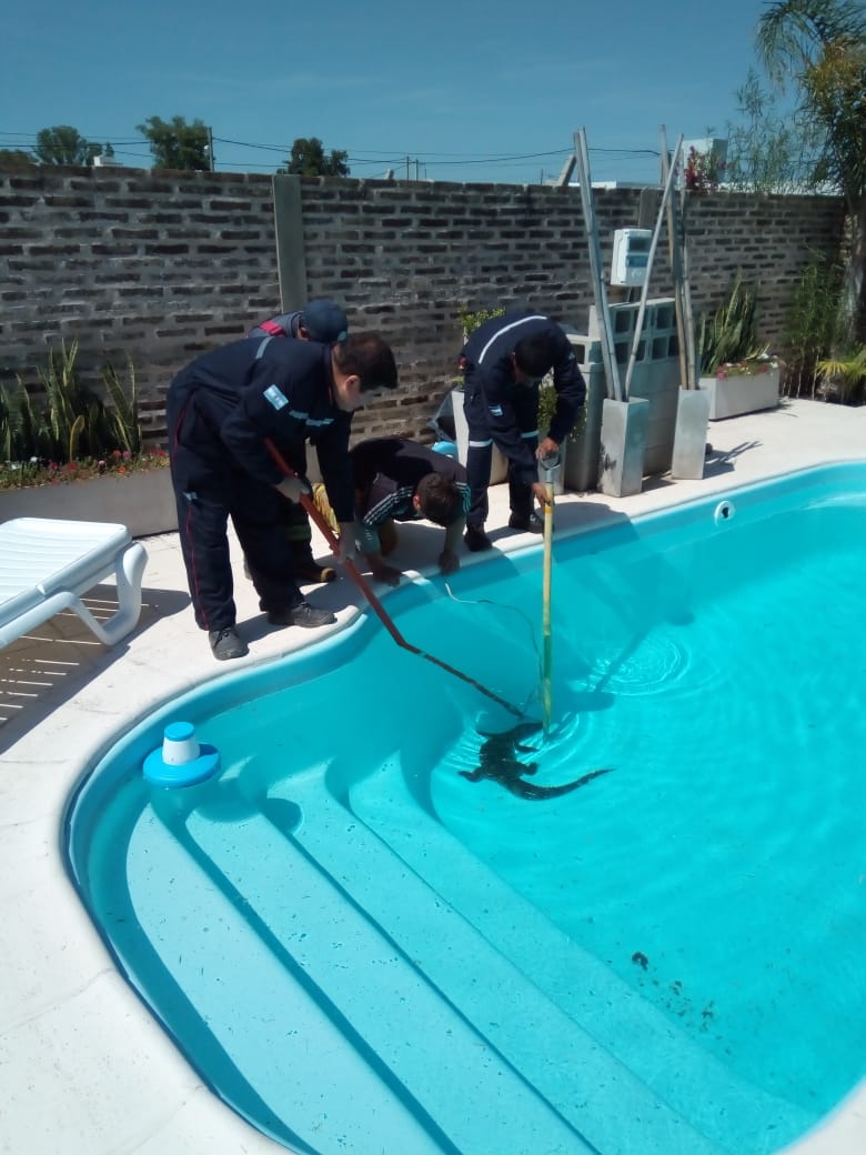 El propietario de la finca denunció el hallazgo del animal salvaje en el natatorio. Personal del cuerpo activo de la ciudad llevo a cabo el operativo de rescate y entrega a la GSR Los Pumas, quienes lo devolvieron a su habitad natural.
