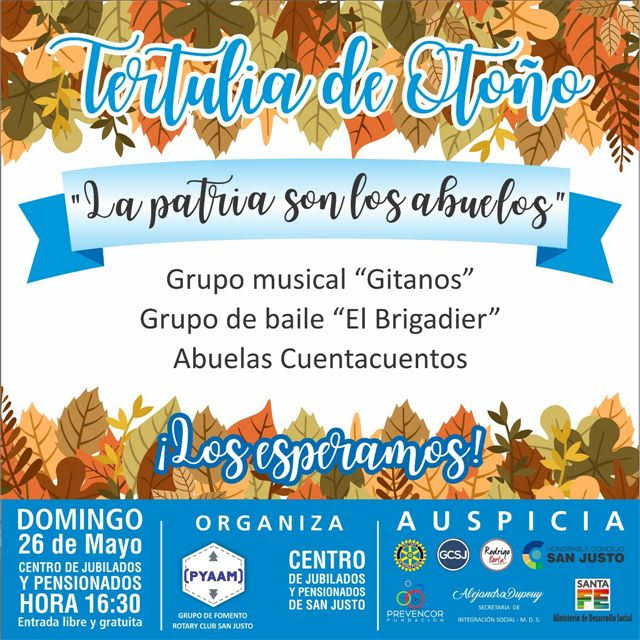 “TERTULIA DE OTOÑO ” ” LA PATRIA SON LOS ABUELOS”, placentera reunión animada que contará con la participación de “ABUELOS CUENTACUENTOS”, Grupo Musical “GITANOS”, Grupo de Baile “EL BRIGADIER” en torno a la temática “25 de MAYO” y otros detalles más que iremos cubriendo con el devenir de los días.