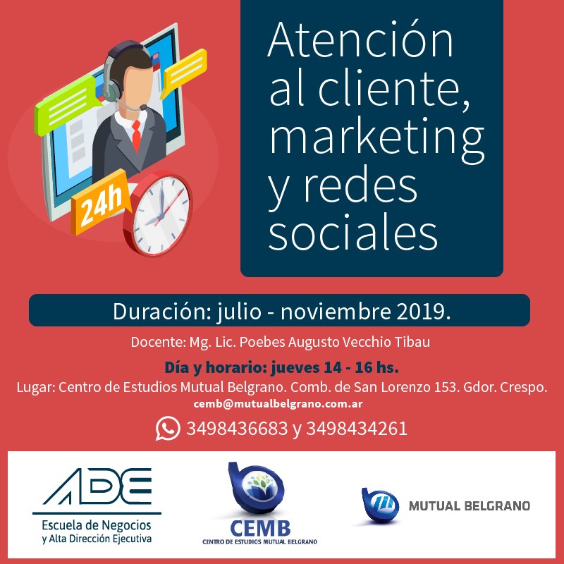 En esta ocasión el Centro de Estudios Mutual Belgrano invita a tomar parte de este curso de Atención al Cliente, Marketing y Redes Sociales que se extenderá de julio a noviembre, los días jueves de 14 a 16 horas en el propio CEMB y que será dictado por el docente: Mg. Lic. Poebes Augusto Vecchio Tibau.