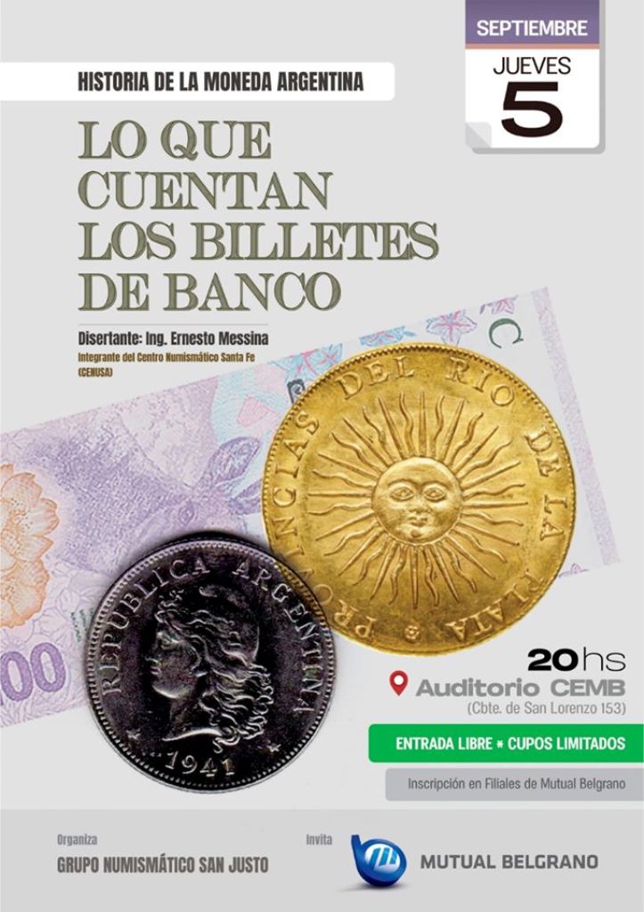 La misma se desarrollará el día jueves 5 de septiembre desde las 20 horas en el Auditorio del CEMB (San Lorenzo 153), está organizada por el Grupo Numismático San Justo y cuenta con la adhesión de Mutual Belgrano.