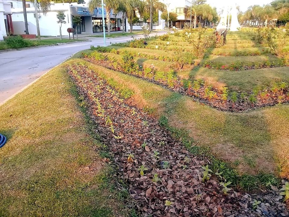 Las hojas secas recolectadas en otoño están siendo utilizadas para cobertura del suelo, en los espacios públicos donde se implantaron plantines de flores.