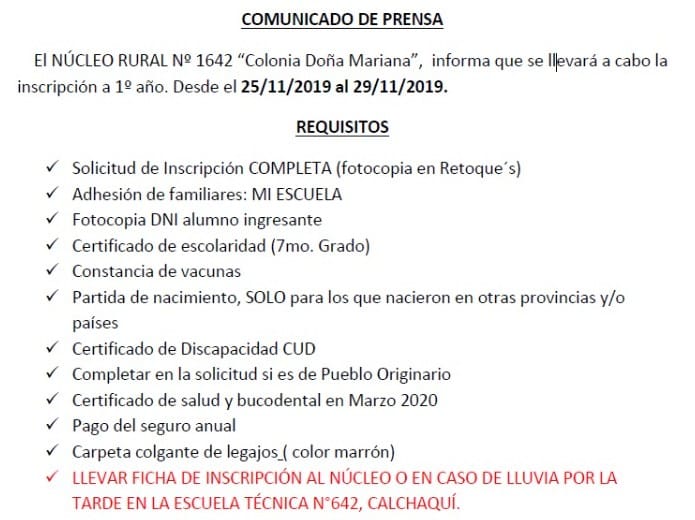 Inscriben a alumnos en el Núcleo Rural Nº 1642 “Doña Mariana”