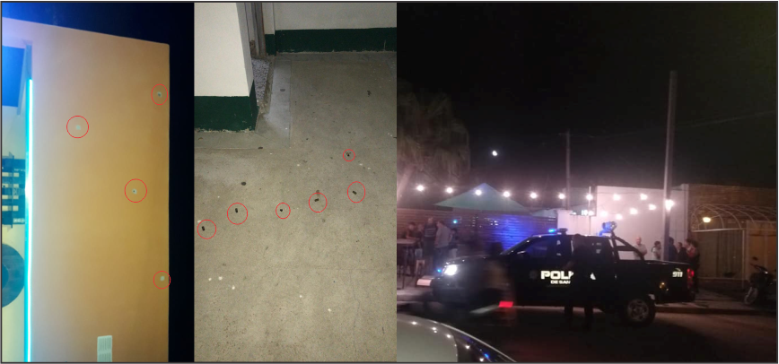 Momentos antes una persona que vestía uniforme policial y en todo momento usando casco, ingresa al lugar, efectuando varios disparos de arma de fuego impactando en distintos lugares del local, sin llegar a lesionar a las personas que circunstancial mente se encontraban en el esparcimiento.