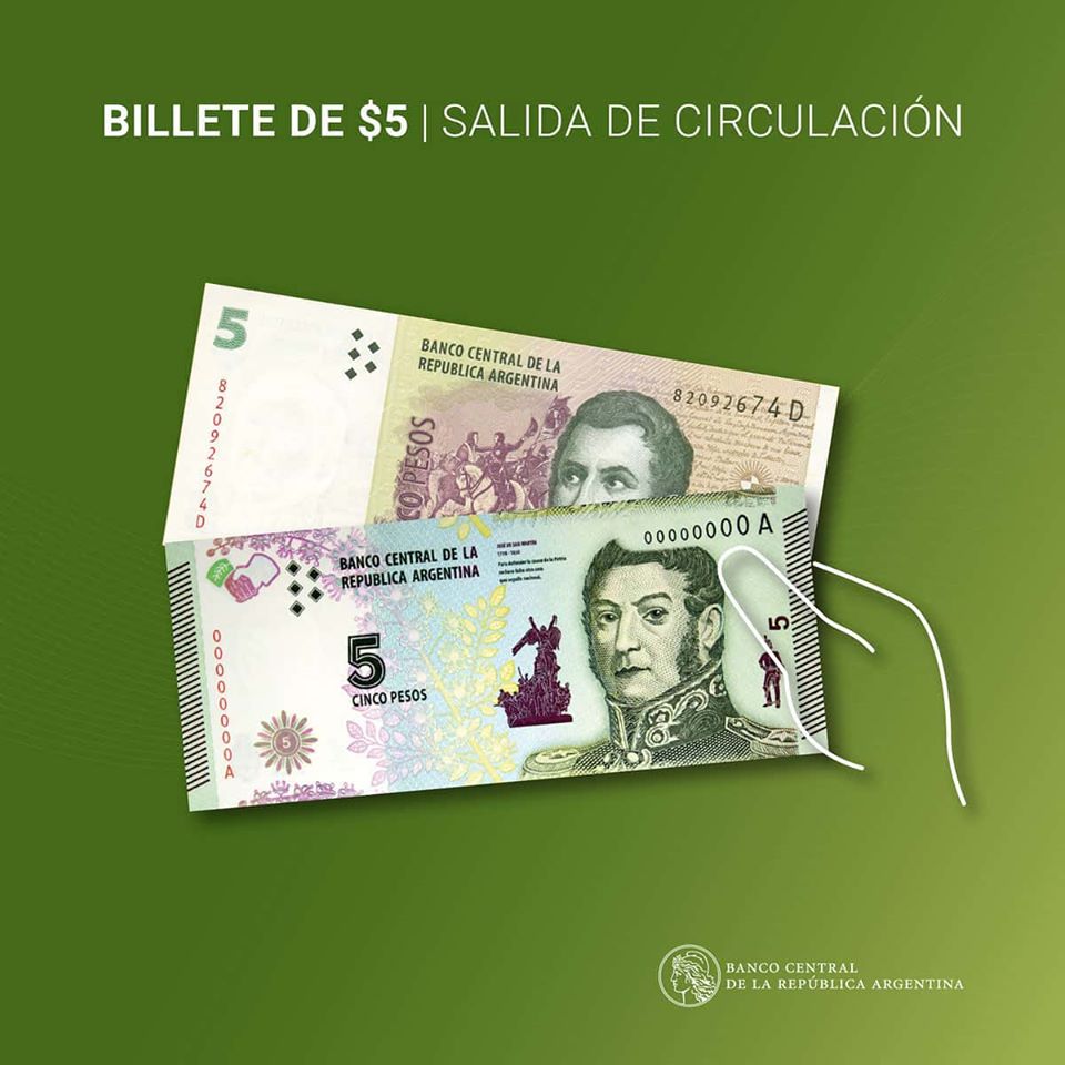 Al tratarse del billete de menor denominación, el papel de 5 pesos sufre un deterioro más veloz que el resto de los billetes. Actualmente circulan 459,6 millones de unidades de este billete con la imagen del General José de San Martín en su anverso, que se emitió a partir de 1998. Desde el 1° de agosto de 2019, ya se retiraron de circulación más de 50 millones de billetes.