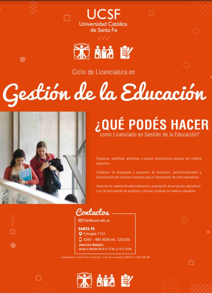 Además, desde la nuestra Casa de Estudios se recuerda la posibilidad de sumarse a la propuesta vinculada a la Licenciatura en Gestión Educativa (carrera a dictarse exclusivamente en la ciudad de San Javier). Esta especialidad permite Organizar, planificar, gestionar y evaluar instituciones propias del sistema educativo, colaborar en programas y proyectos de formación, perfeccionamiento y actualización de recursos humanos para el desempeño de roles educativos, asesorar en materia de administración y evaluación de proyectos educativos y en la formulación de políticas y normas jurídicas en materia educativa.