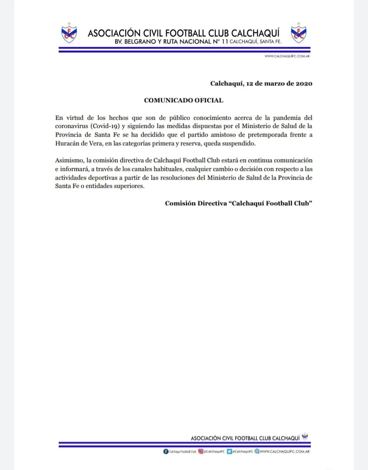 La Comisión Directiva del Calchaquí FC comunicó a sus aficionados la suspensión del encuentro previsto para esta noche en su cancha, como parte de los trabajos de pretemporada. Todo en consonancia con las medidas y resoluciones del Ministerio de Salud de la provincia de Santa Fe.