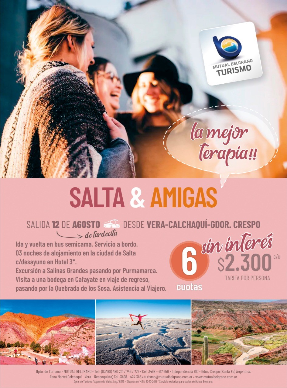 El departamento de turismo de la Mutual Belgrano te invitamos a consultar y sumarte con la debida anticipación a esta Salida Grupal solo para Mujeres, programada para agosto y con destino Salta, además podes aprovechar la increíble financiación de Mutual Belgrano. La salida está programada desde: Vera, Calchaquí y Gobernador Crespo.