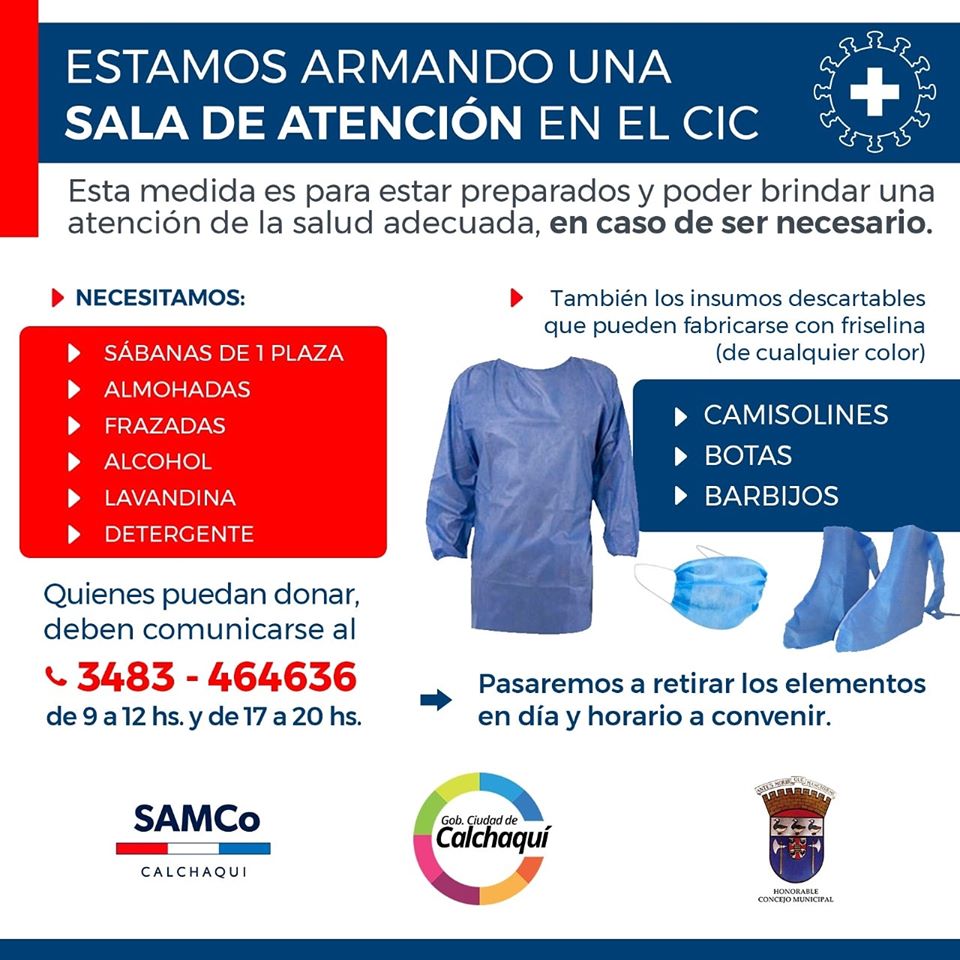 El municipio de Calchaquí está armando una sala de atención en el Centro Integrador Comunitario. Se necesitan ropas de cama, productos de limpieza e insumos descartables en fiselina. Se pueden donar al teléfono 3483 – 464636.