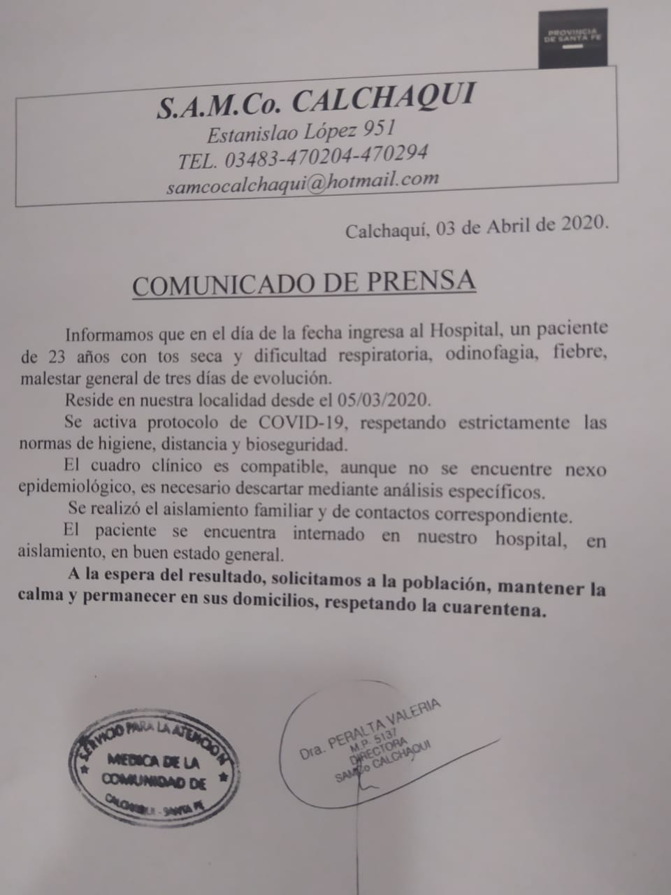 Mediante un comunicado – firmado por la directora Valeria Peralta – el Hospital Ricardo Aldao informó sobre el estado del paciente internado. Presenta un “buen estado general y se está a la espera del resultado”.