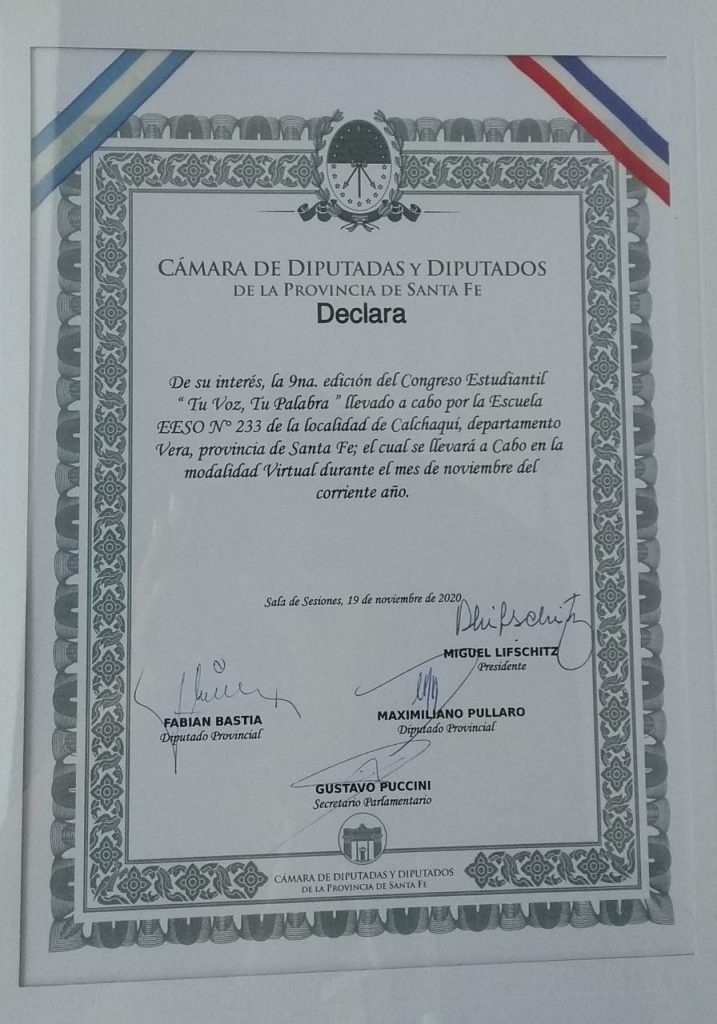 La Declaración de Interés del 9° Congreso Estudiantil “Tu voz, tu palabra”, se dio en la Sala de Sesiones de la Cámara de Diputadas y Diputados de la Provincia de Santa Fe, el día 19 de noviembre de 2020 y está refrendada por el Presidente de la Cámara Baja, Miguel Lifschitz, por los Diputados Fabián Bastía y Maximiliano Pullaro y por el Secretario Parlamentario, Gustavo Puccini.
