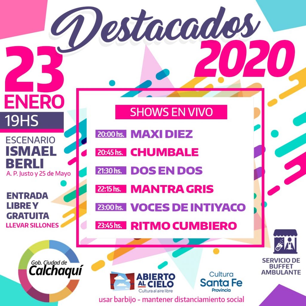 “Destacados 2020” tendrá lugar este sábado 23 de enero desde las 19 horas, con artistas locales y regionales de diversos géneros y ritmos para toda la familia. Será obligatorio el uso de barbijo, el distanciamiento social y el cupo será limitado a espacios delimitados.