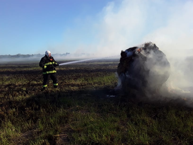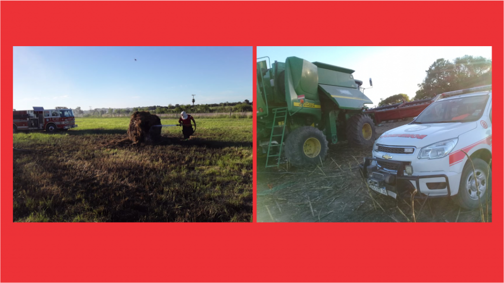 Este miércoles, los bomberos voluntarios debieron apagar focos ígneos en dos campos cercanos al casco urbano – de las familias Pighín y Perello – que se habrían producido por desperfectos en una máquina trilladora y una enfardadora.
