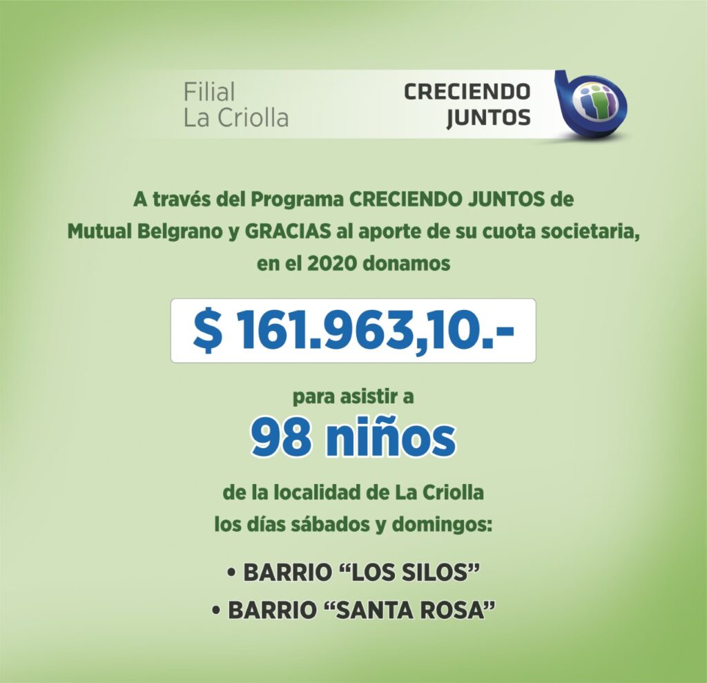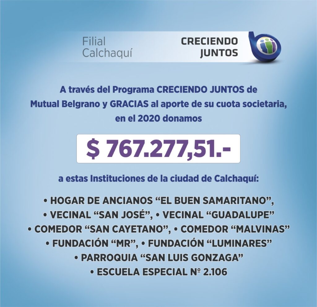 Mutual Belgrano aportó en 2020 casi $930 mil pesos del programa “Creciendo Juntos” en Calchaquí y La Criolla