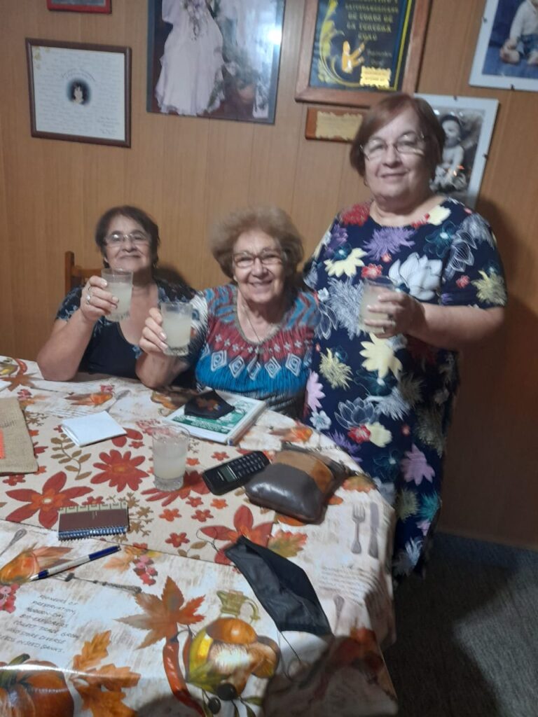 En la foto, la profesora Olga Raffo, en casa de la Directora del Coro Mary Baroni de Coronica, junto a sus compañeras coreutas Elsa Villalba y Graciela Binaghi, al recibir la Notificación del caso, que ha tomado por sorpresa a la agasajada.