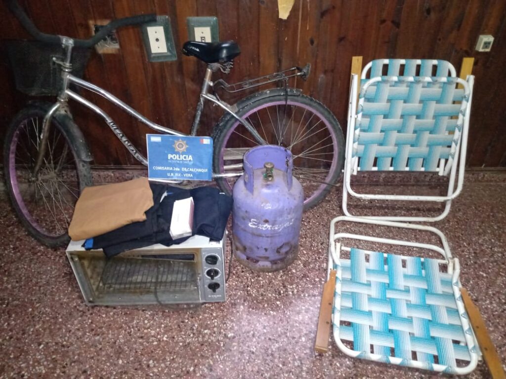 La policía de la Comisaria II de Calchaquí esclareció – este domingo – los hechos delictivos cometidos por dos jóvenes de 18 y 23 años, donde se apoderaron de una bicicleta, horno eléctrico, sillones, entre otras pertenencias tras saltar un tapial en la vivienda de una jubilada como también prendas de vestir de un comercio.