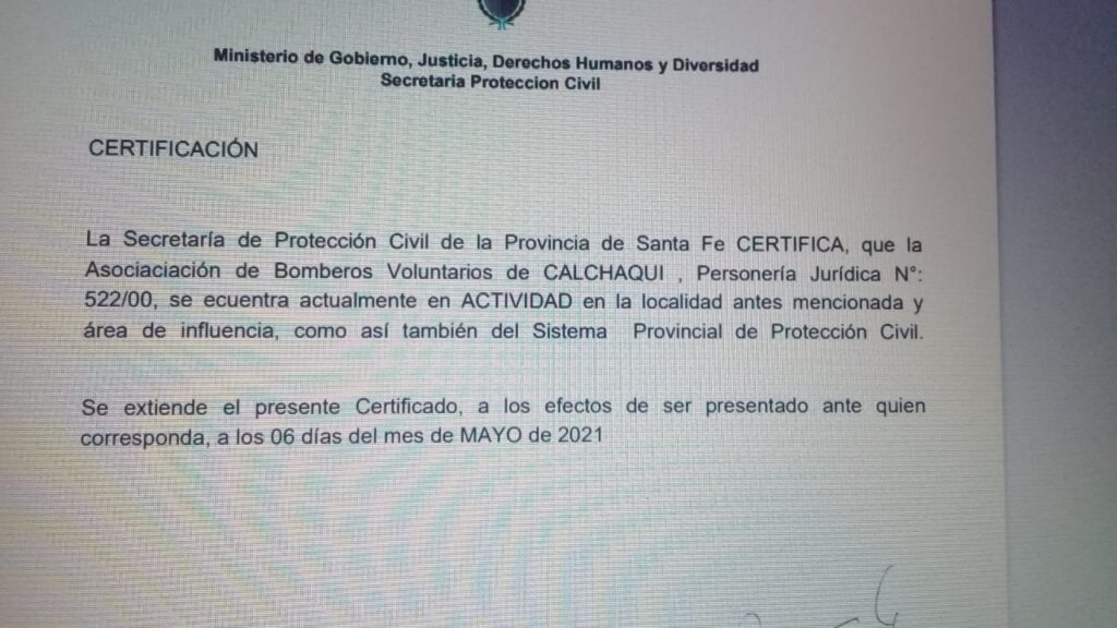 La Secretaría de Protección Civil de la provincia certificó que la Asociación de Bomberos Voluntarios de Calchaquí, con personería jurídica Nº 522/00, se encuentra actualmente en actividad en la localidad antes mencionada y área de influencia.