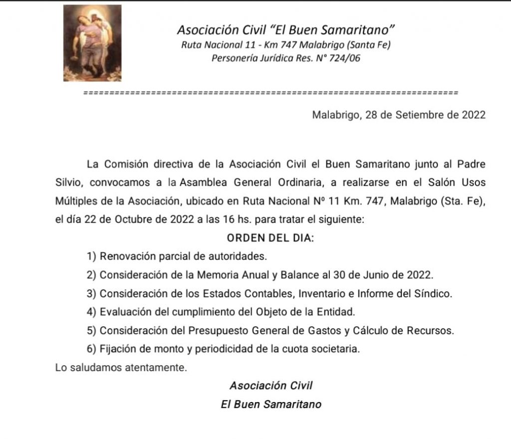 La comisión directiva de la Asociación Civil El Buen Samaritano – junto al Padre Silvio – convoca el día 22 de octubre a las 16 horas a la Asamblea general ordinaria a realizarse en el Salón de Usos Múltiples de la Asociación ubicado en Ruta Nacional Nº 11 KM 747 de la ciudad de Malabrigo.