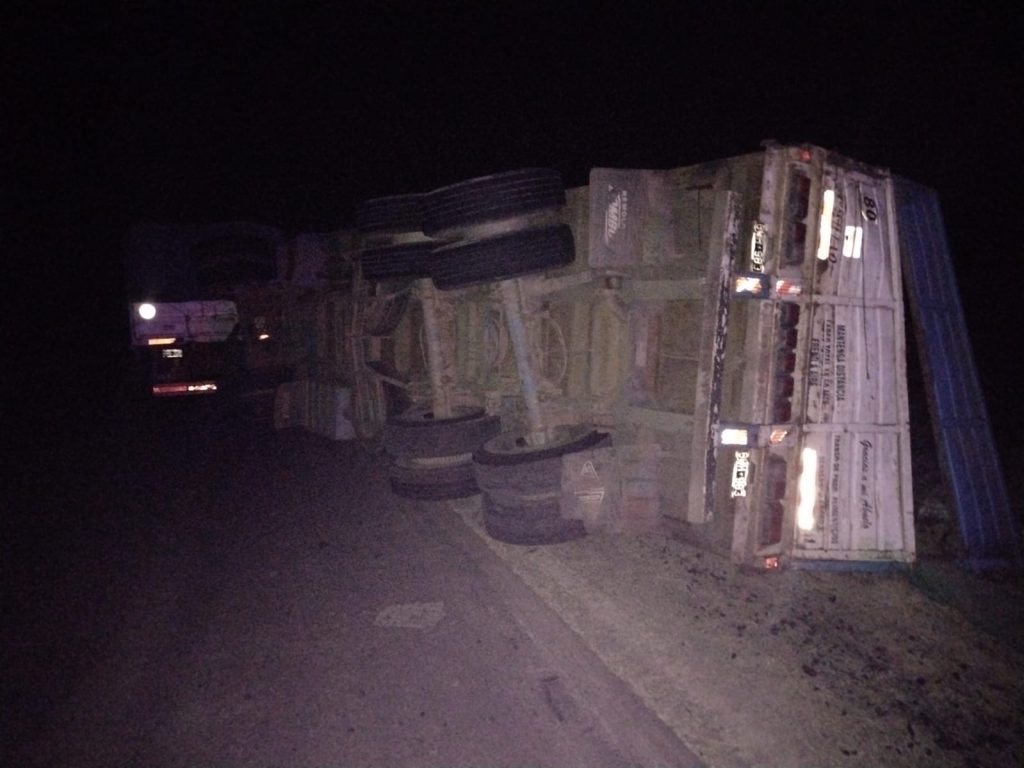 Cerca de la medianoche, se produjo el fuerte siniestro vial que provocó el corte de la ruta nacional 11 por el vuelco del transporte que desparramó su carga  sobre la cinta asfáltica.