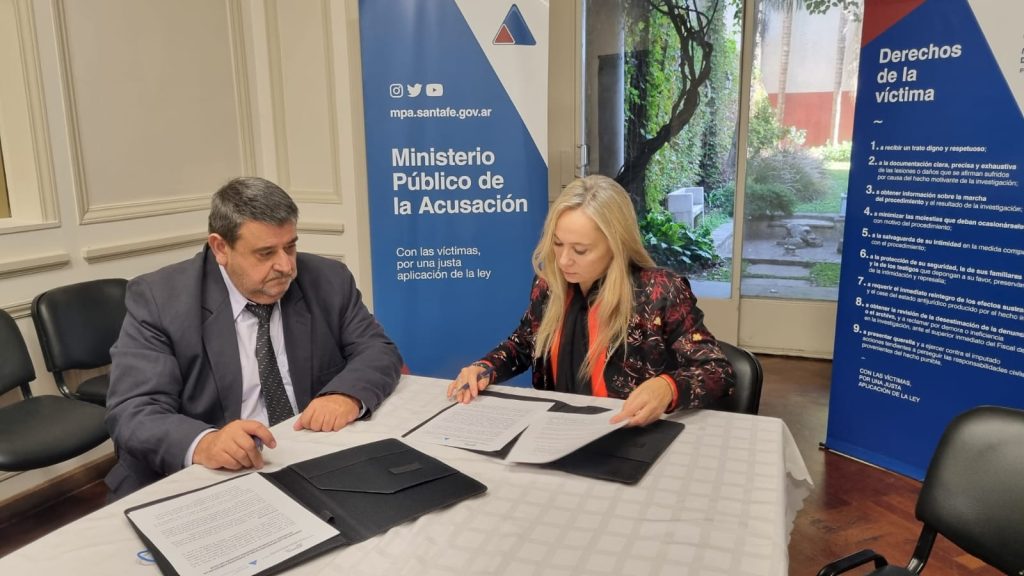 La Fiscal General del MPA, María Cecilia Vranicich, y el director de la Caja de Pensiones Sociales Ley 5.110, José Luis Rossetto, firmaron un convenio en la Fiscalía General en la ciudad de Santa Fe. La finalidad del documento suscrito es instrumentar el otorgamiento de asistencia económica a víctimas de delitos, según lo establecido en el artículo 7 bis de la ley provincial número 5.110, modificada por la ley número 14.177.