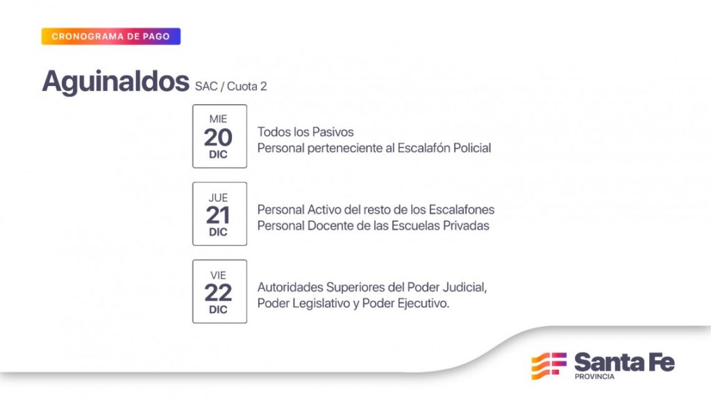 El miércoles 20 se dará inicio al pago del aguinaldo para los agentes provinciales. En primer turno cobrarán todos los pasivos y el personal perteneciente al escalafón policial. El jueves 21 será el turno del personal activo del resto de los escalafones y el personal docente de las escuelas privadas. Finalmente, el viernes 22 cobrarán las autoridades superiores del Poder Judicial, Poder Legislativo y Poder Ejecutivo.