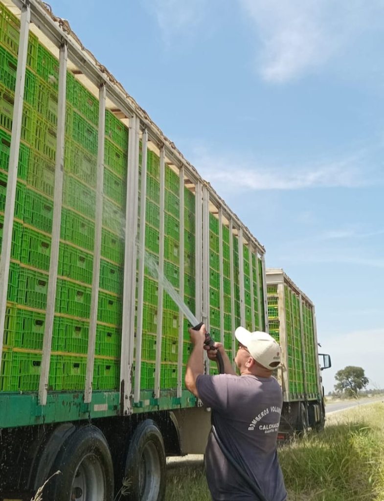 Bomberos voluntarios de Calchaquí arrojaron agua a pollos de un camión varado en la ruta 11