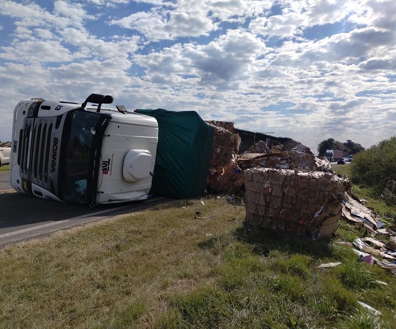 Un camión marca Scania semi remolque cargado con cartón para reciclaje, por causas que se tratan de establecer, tumbo sobre la ruta.