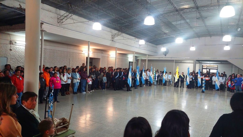 Además hubo un agradecimiento especial a la Udes C del barrio Santa Rosa, quienes confeccionaron escarapelas que alumnos de nivel inicial distribuyen en el acto.