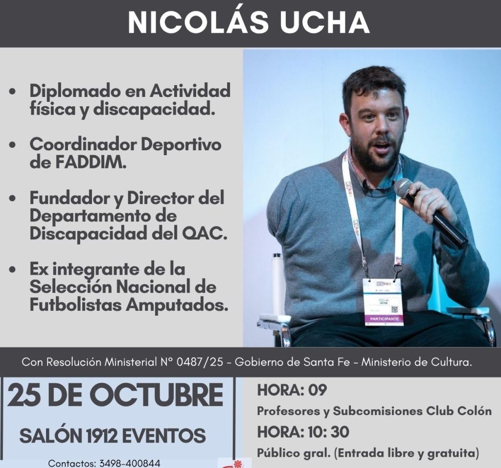 La Subcomisión de Promoción Cultural del Club Colón de San Justo invita a participar de la charla–taller “El deporte como puente de inclusión. Vivencias”, a cargo de Nicolás Ucha, referente en deporte y discapacidad. El encuentro se realizará el viernes 25 de octubre, en el Salón “1912 Eventos”.
