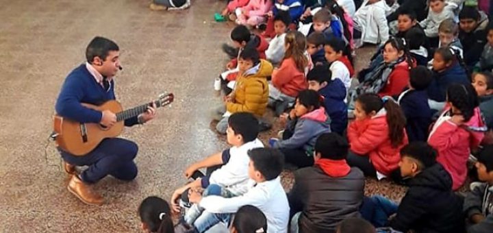 Como parte de su ciclo sobre identidad y valores, el músico y cantor sanjustino compartió una charla con canciones, historias y cuentos a los alumnos y docentes de la escuela Nº 448...