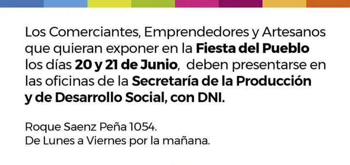 Desde la Secretaria de Producción de Calchaquí, invitan a emprendedores, artesanos y comercios de la localidad; a inscribirse para participar de la Feria a realizarse los días 20 y 21 de junio,...
