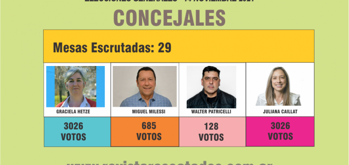 El actual presidente comunal se impuso por 781 votos a los candidatos Hernán Díaz (PJ) y Jorge Ramón Faisal (Mejor). Agrupación/Candidato Votos Porcentaje FRENTE PROGRESISTA CÍVICO Y SOCIALNICOLA JOSE FERNANDO 781 46,49%...